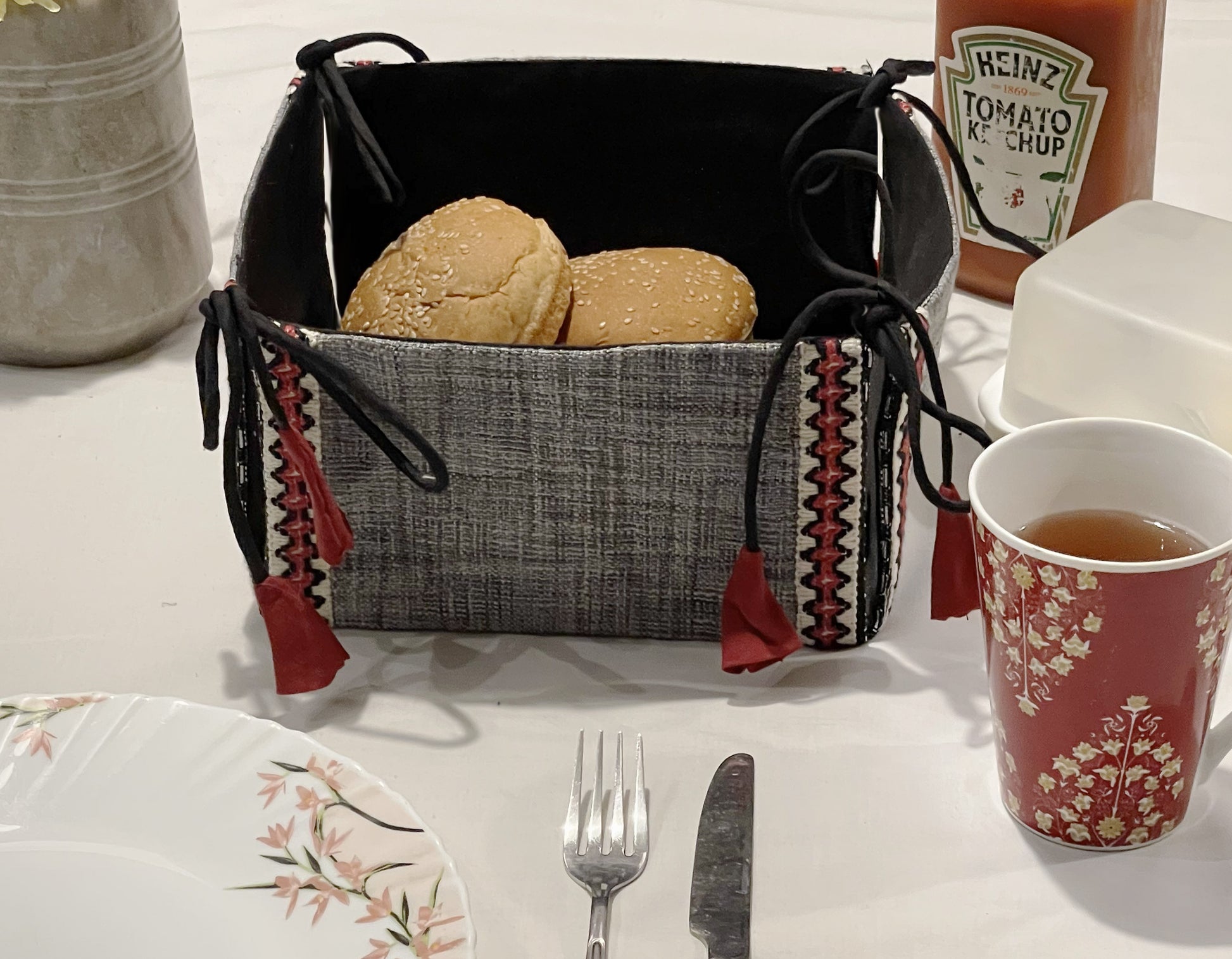 PRODUCT DESCRIPTION: Serve your breads in our handloom fabric Affera Bread basket adorned with dash of red lace and trimming. These are washable and can be easily stored flat after opening the corner bows.