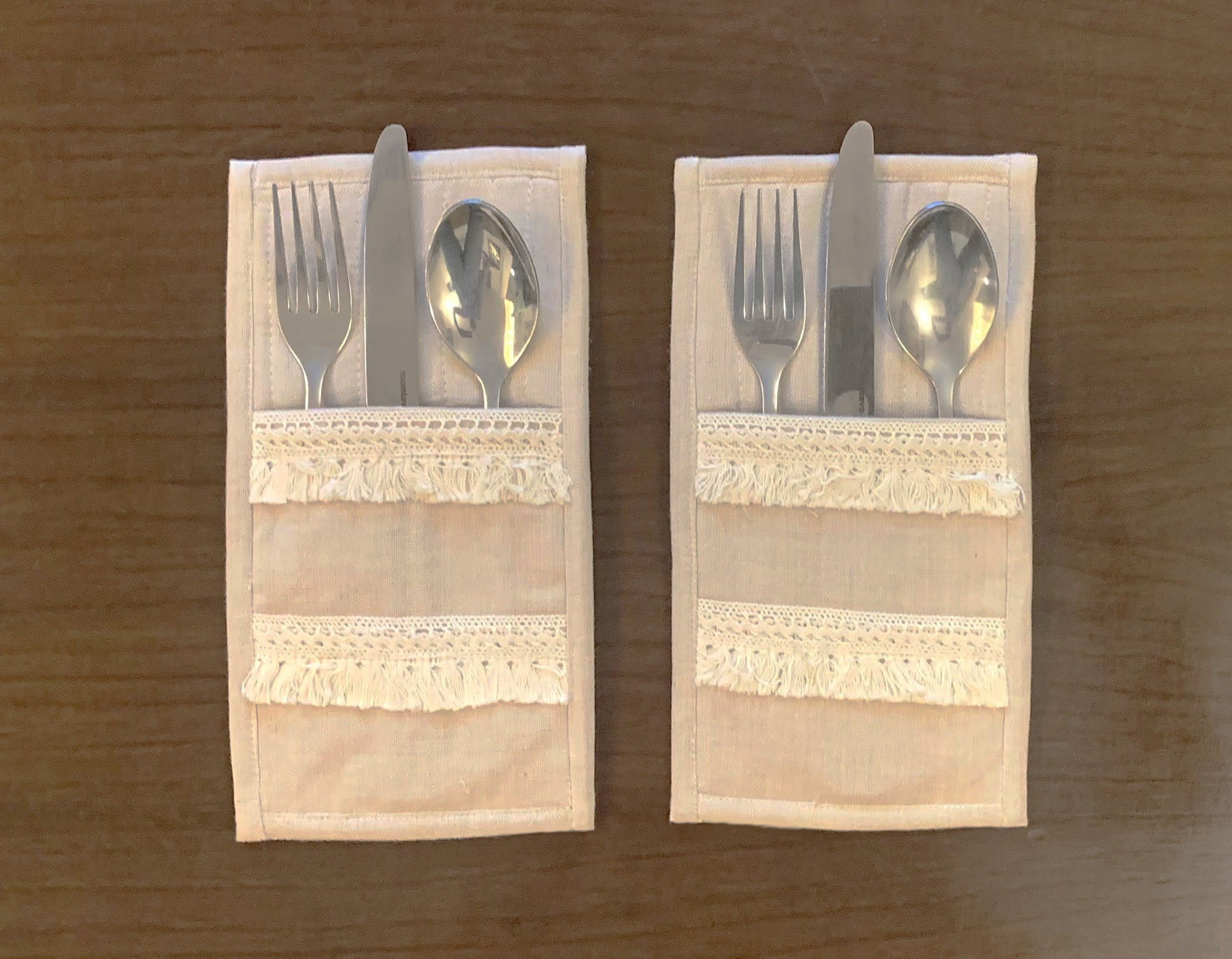 PRODUCT DESCRIPTION: Accessorise your tablescape with these Cutlery holders embellished with lace edgings on the pocket.