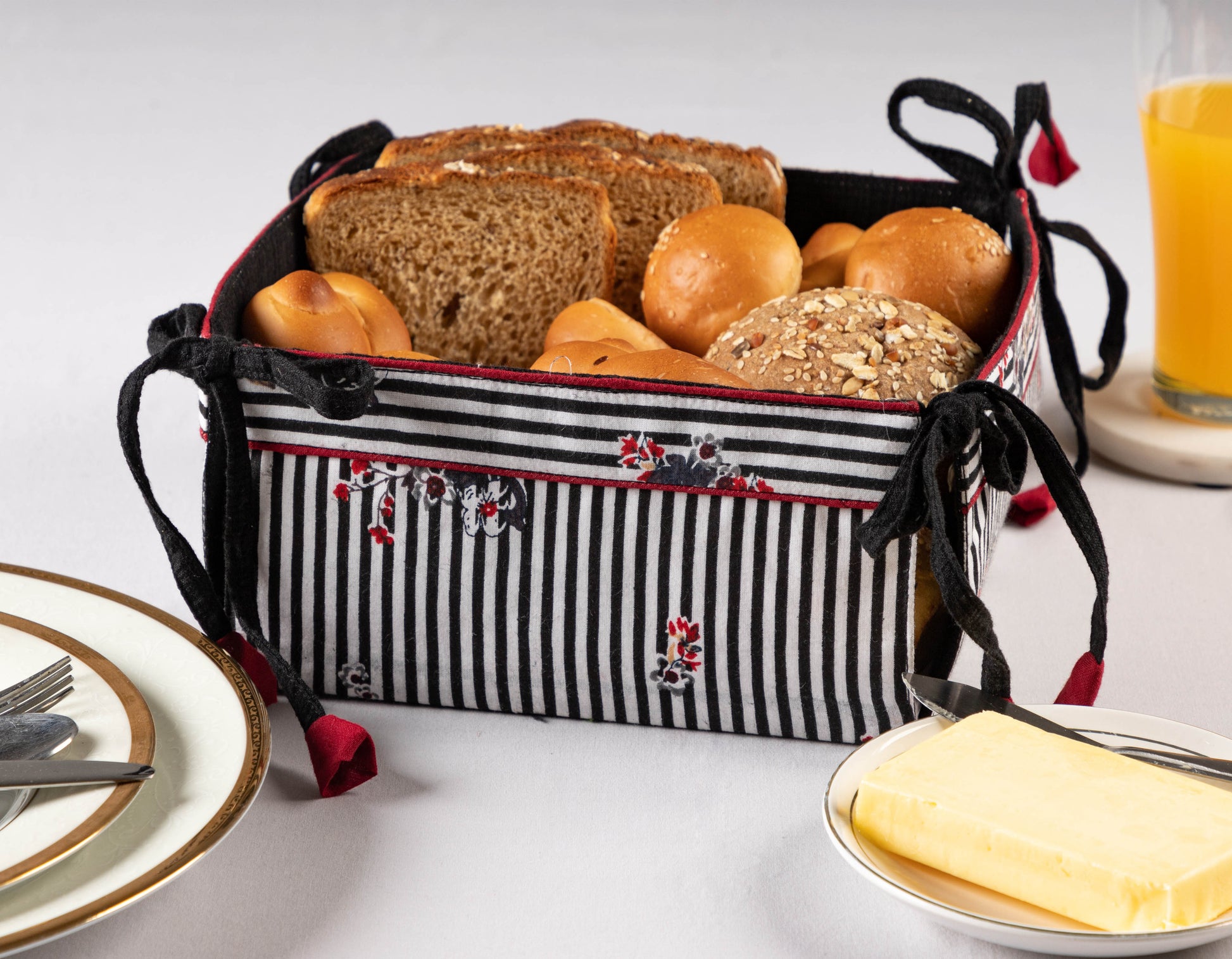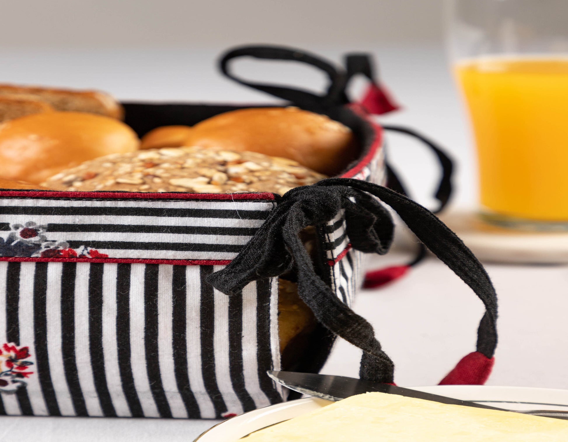 PRODUCT DESCRIPTION: Serve your breads in exclusively designed Arabella Bread basket. The striped basket is adorned with dash of red trimming and string-ties on the corners. These are washable and can be easily stored flat after opening the corner ties.