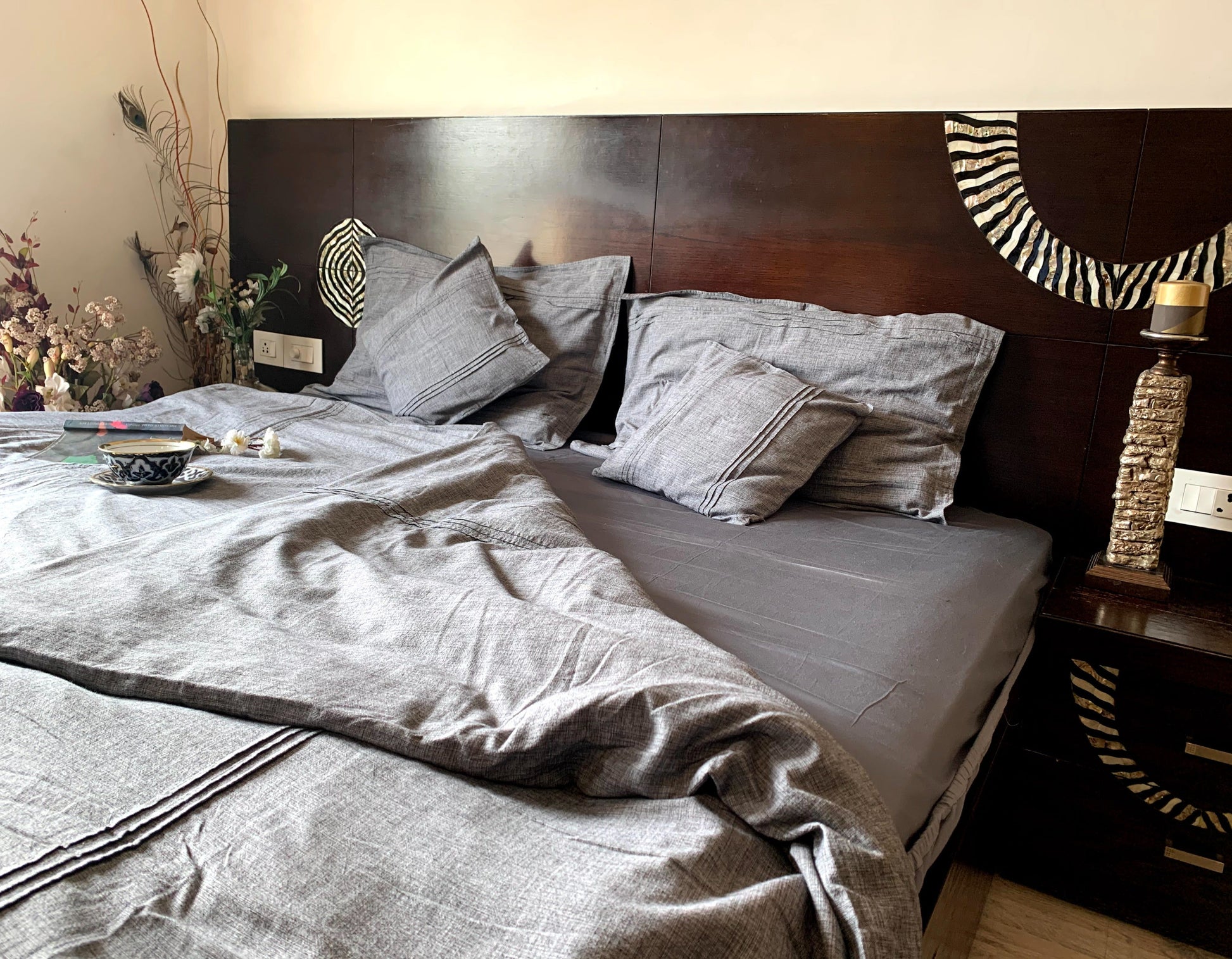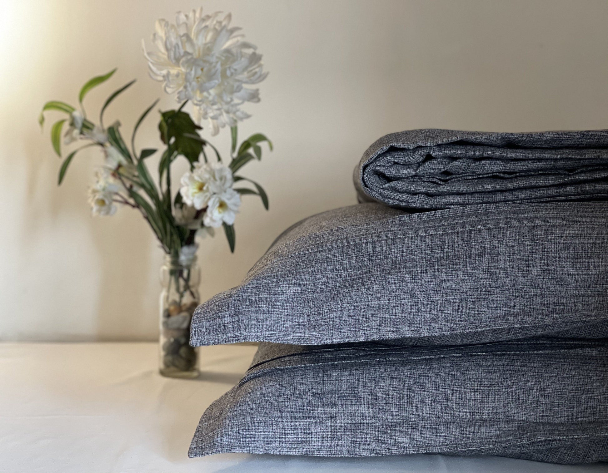 PRODUCT DESCRIPTION: This bed linen bundle in chambray cotton fabric, comprises of a flat sheet, two pillow covers, two cushion covers and a duvet cover. Pin-tucks add grace to the design.