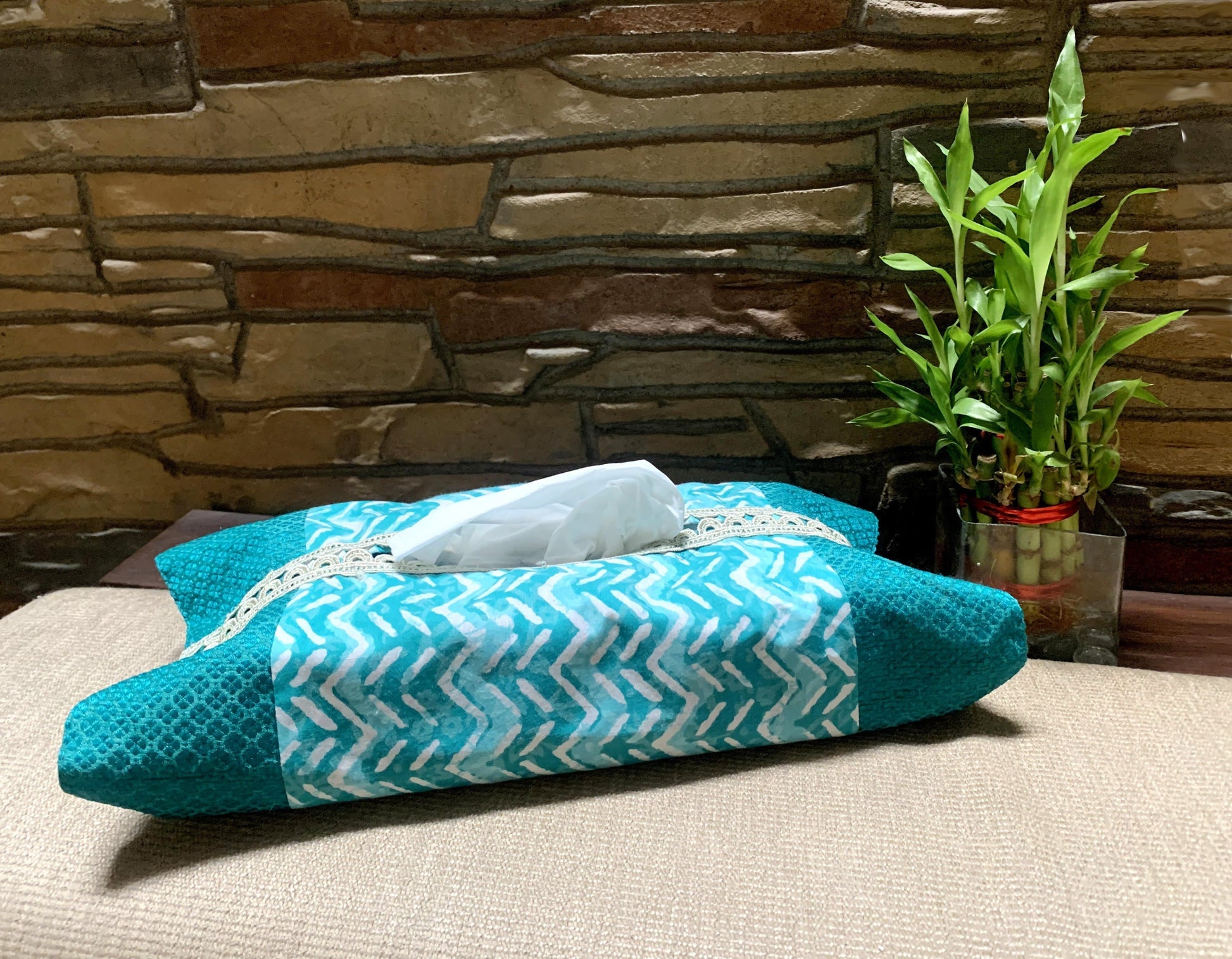 PRODUCT DESCRIPTION: A cyan blue Tissue Box Cover in washable fabric can give an eye-catching look to a must-have box. Its velcro opening on either side makes it easy to slide in the tissue box. The lacy edging on the top opening adds to the beauty.