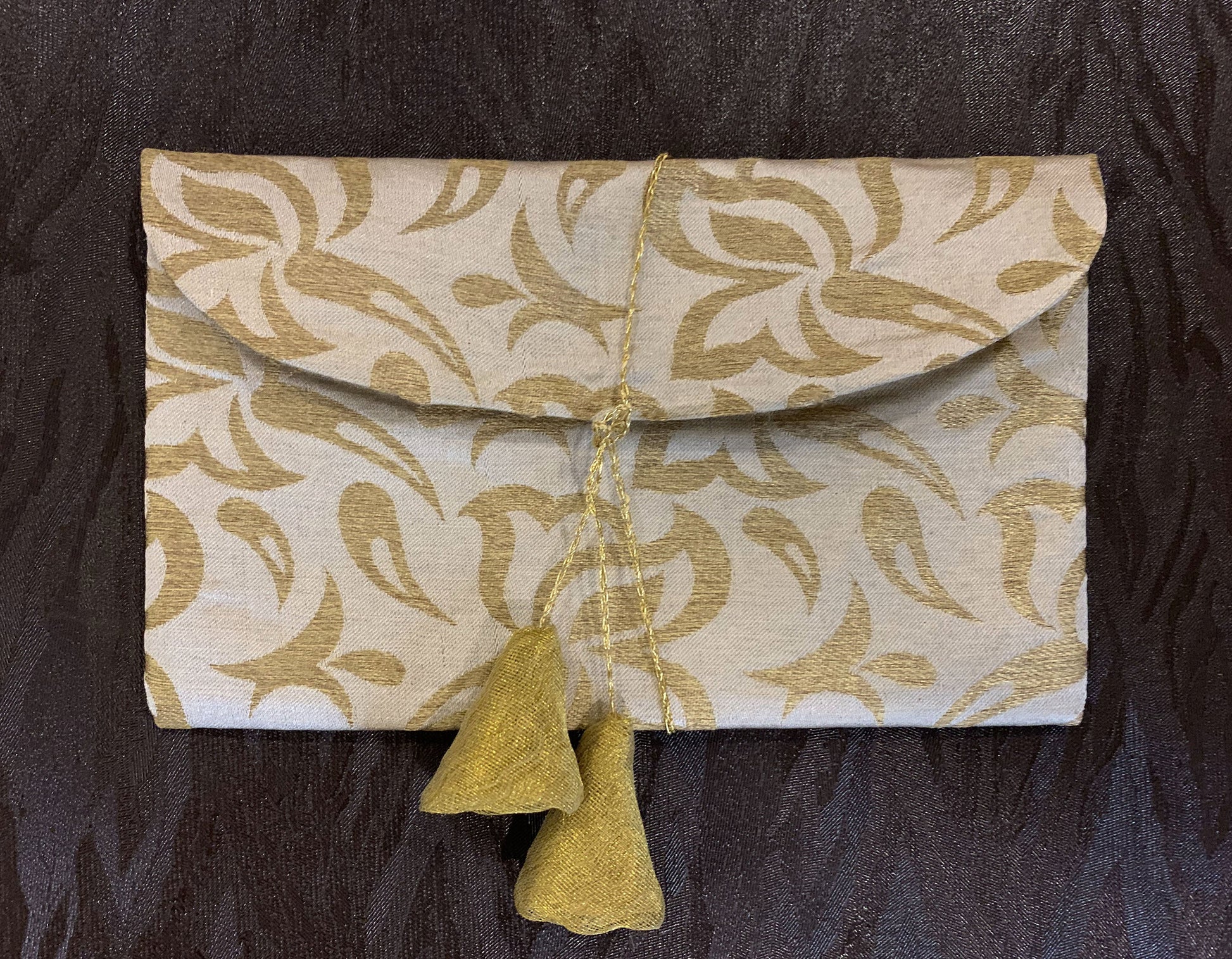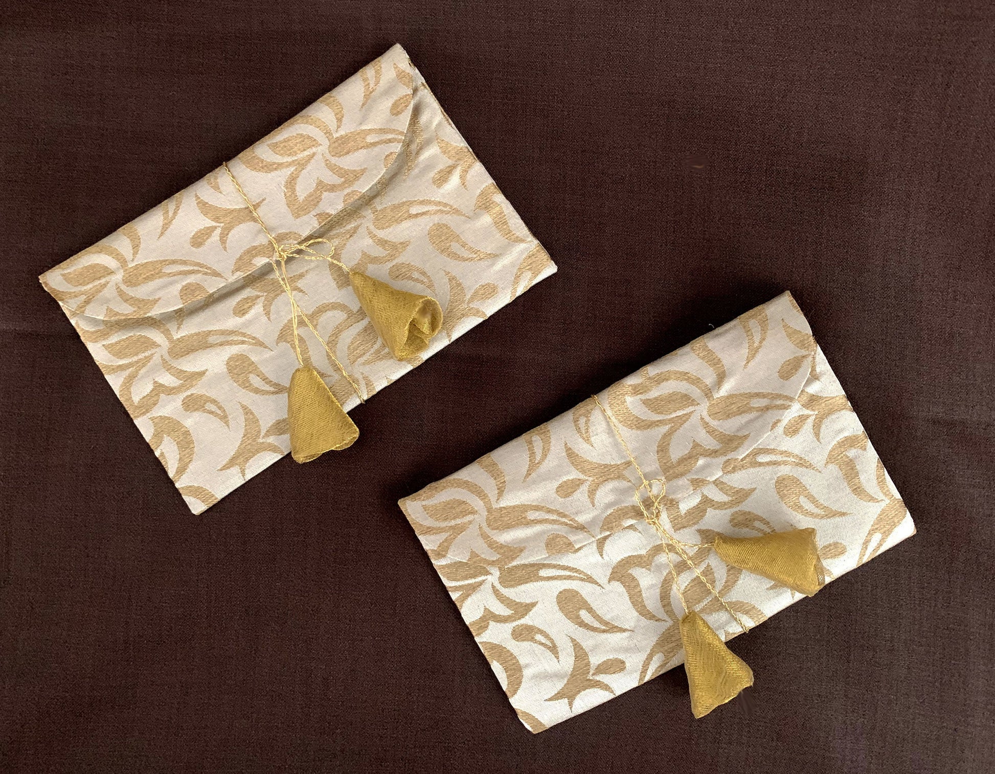PRODUCT DESCRIPTION: These ceremonious Gift Envelopes made with golden jacquard fabric come with a golden string and hangings to secure it while handling.