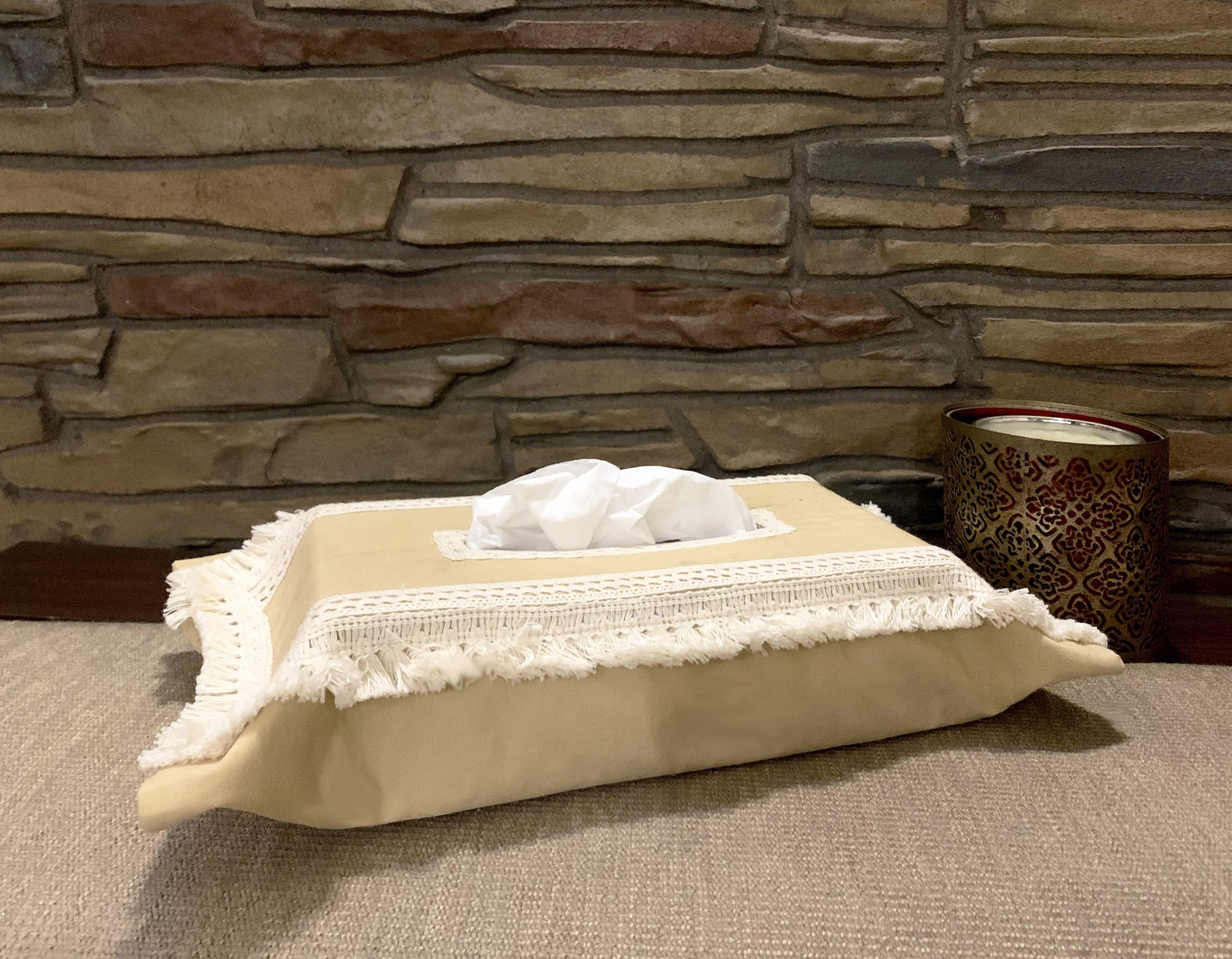 PRODUCT DESCRIPTION: This beige Tissue Box Cover with fringes on the edges has velcro opening on either side, making it easy to slide in the tissue box. Lace on the opening adds to the classy appeal.