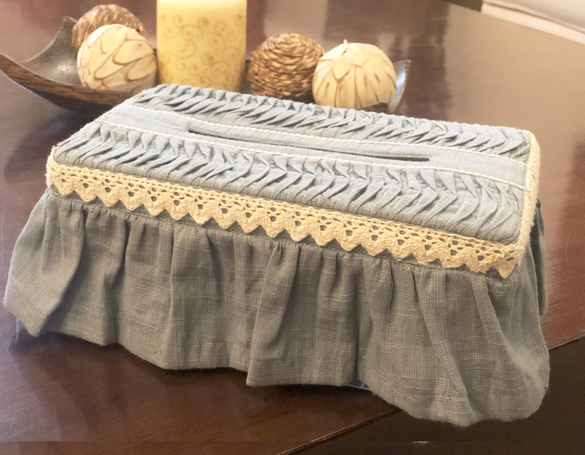 PRODUCT DESCRIPTION: Adorn your tissue boxes with this beautiful Gabie Tissue box cover. The delicate lace and frill edgings add a visual appeal to the setting.