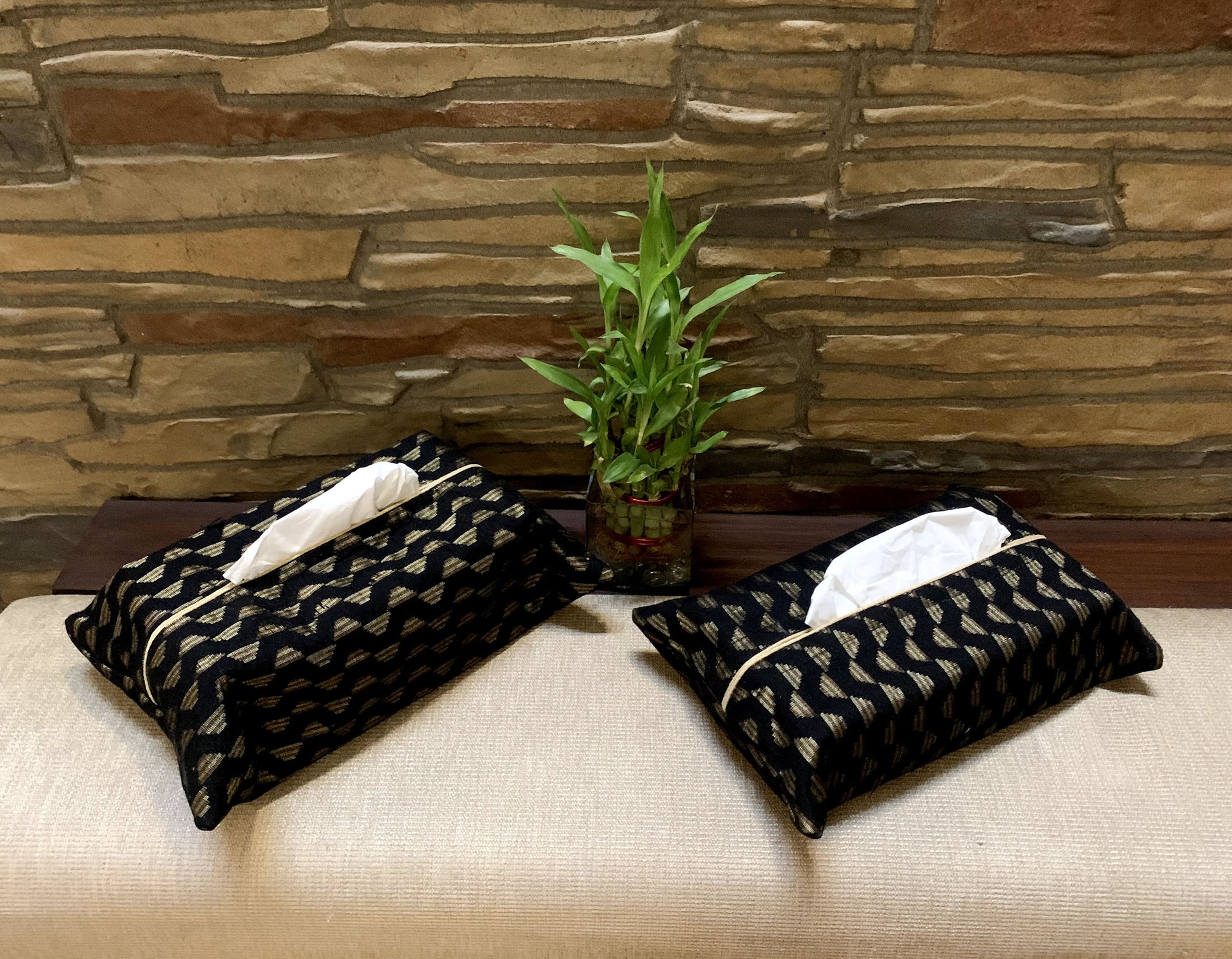 PRODUCT DESCRIPTION: This black & gold brocade Tissue Box Cover can add to your festive layouts. It has golden edgings and a side zipper to open and slide in the tissue box.