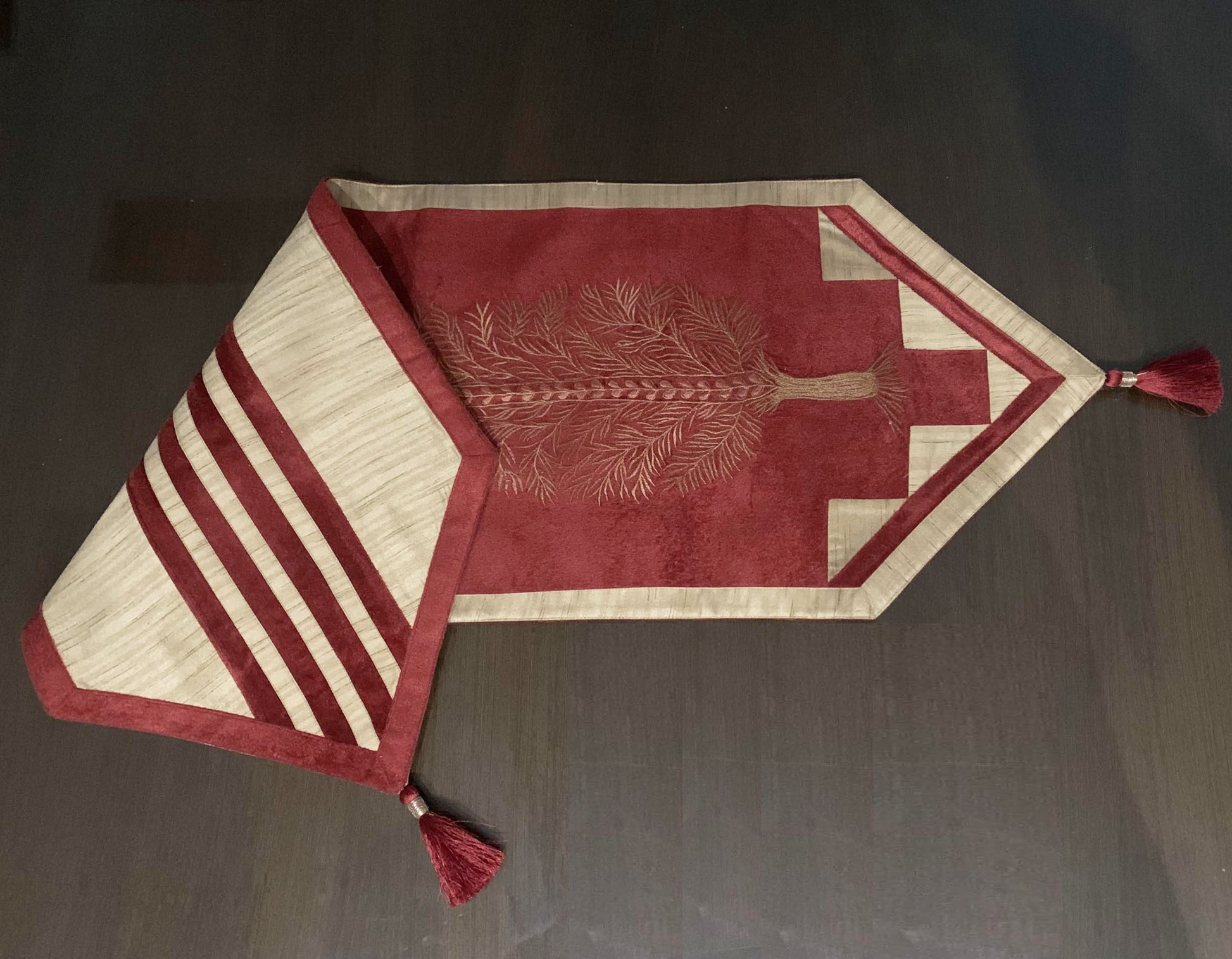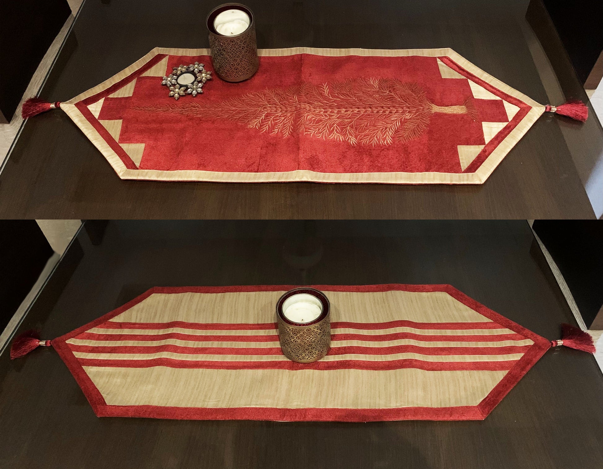PRODUCT DESCRIPTION: This bright reversible Table Runner has an embroidered pattern on one side and a play of stripes on the other. This can amp up the style quotient of any setting.