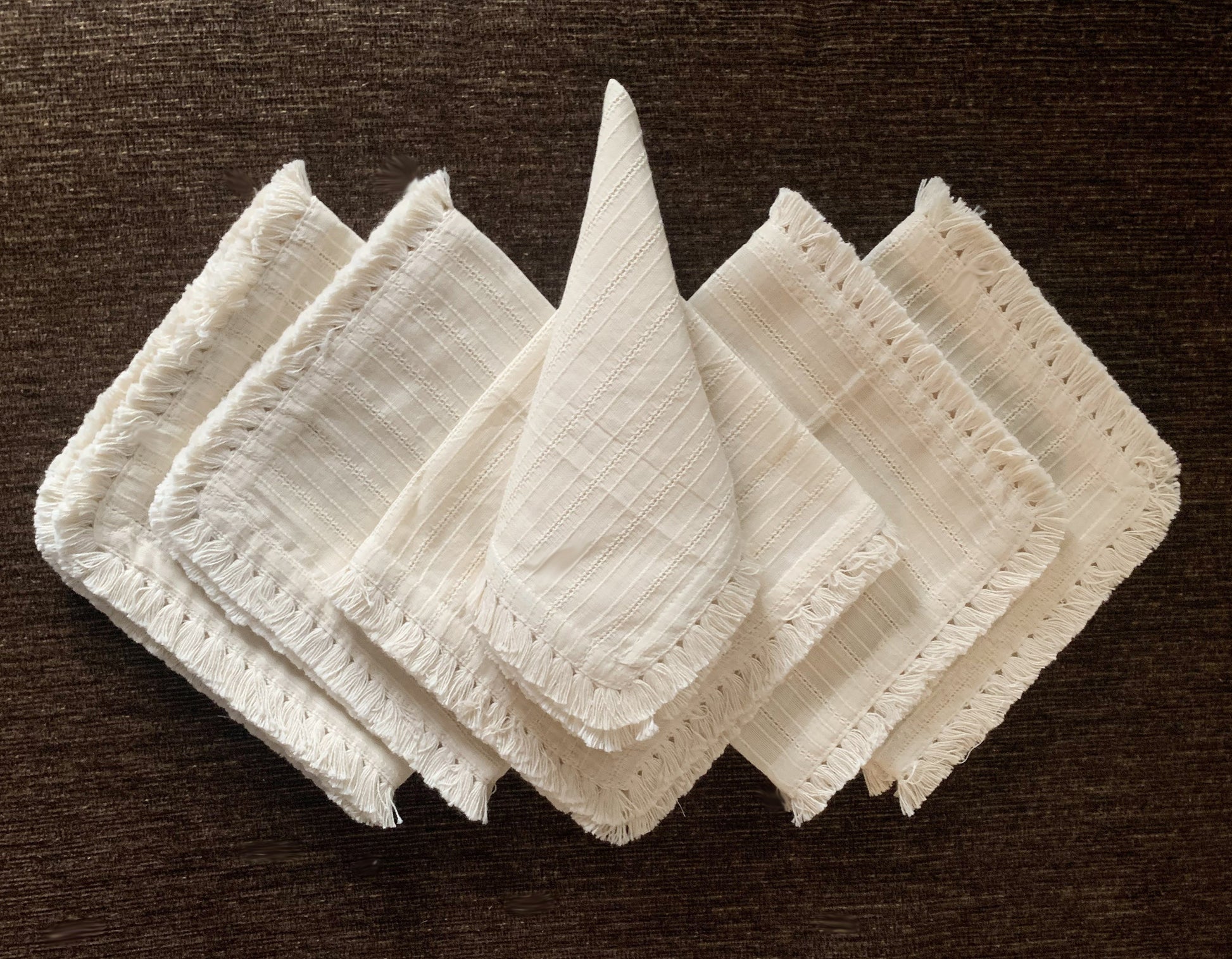 PRODUCT DESCRIPTION: Off-white napkins in daintily embroidered fabric with fringe edgings can look chic on your tea-time ensemble.