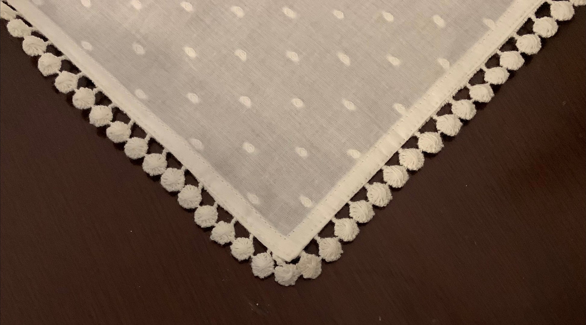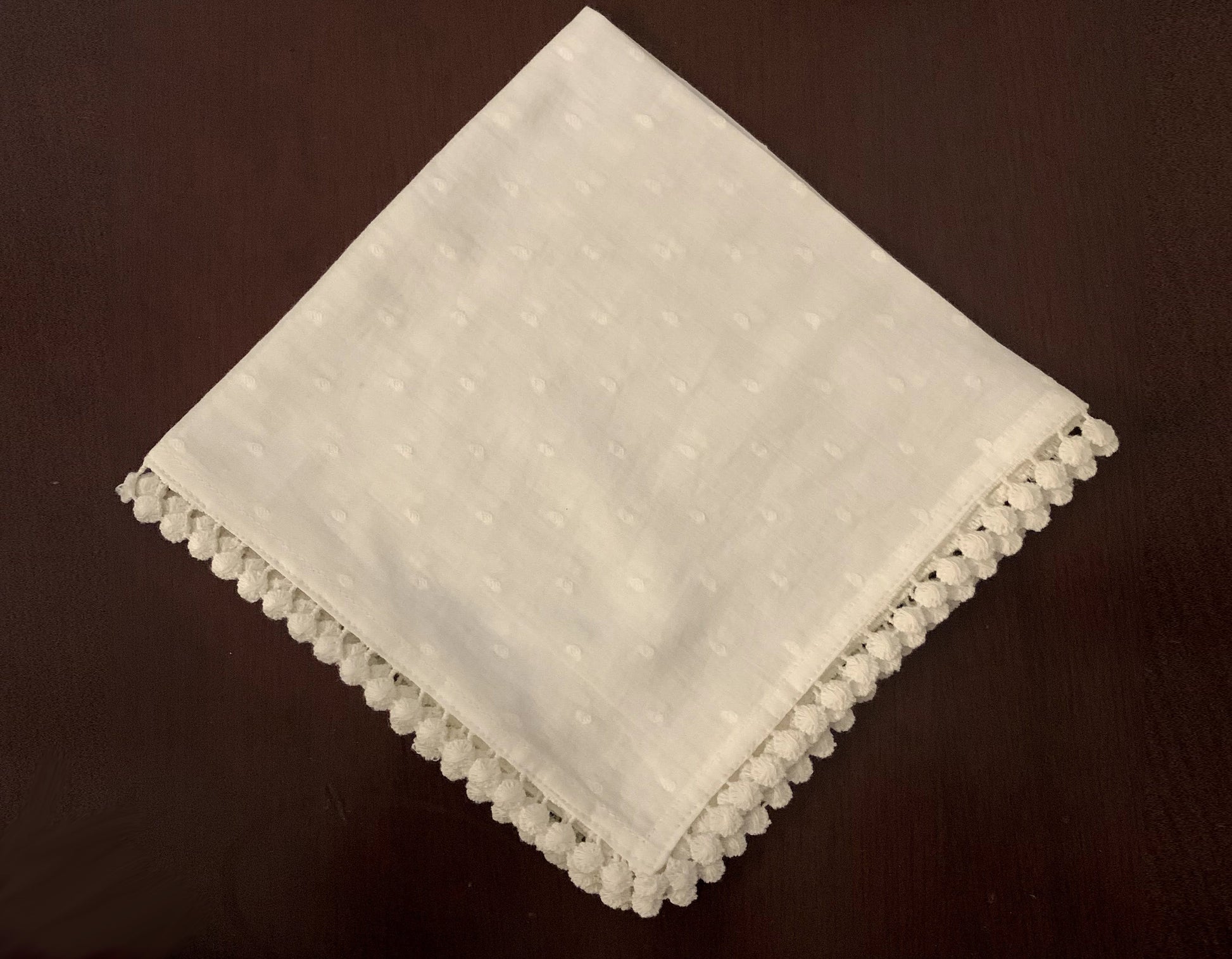 PRODUCT DESCRIPTION: Ivory napkins with dobby fabric and pom-pom edgings can give a touch of style to any setup.
