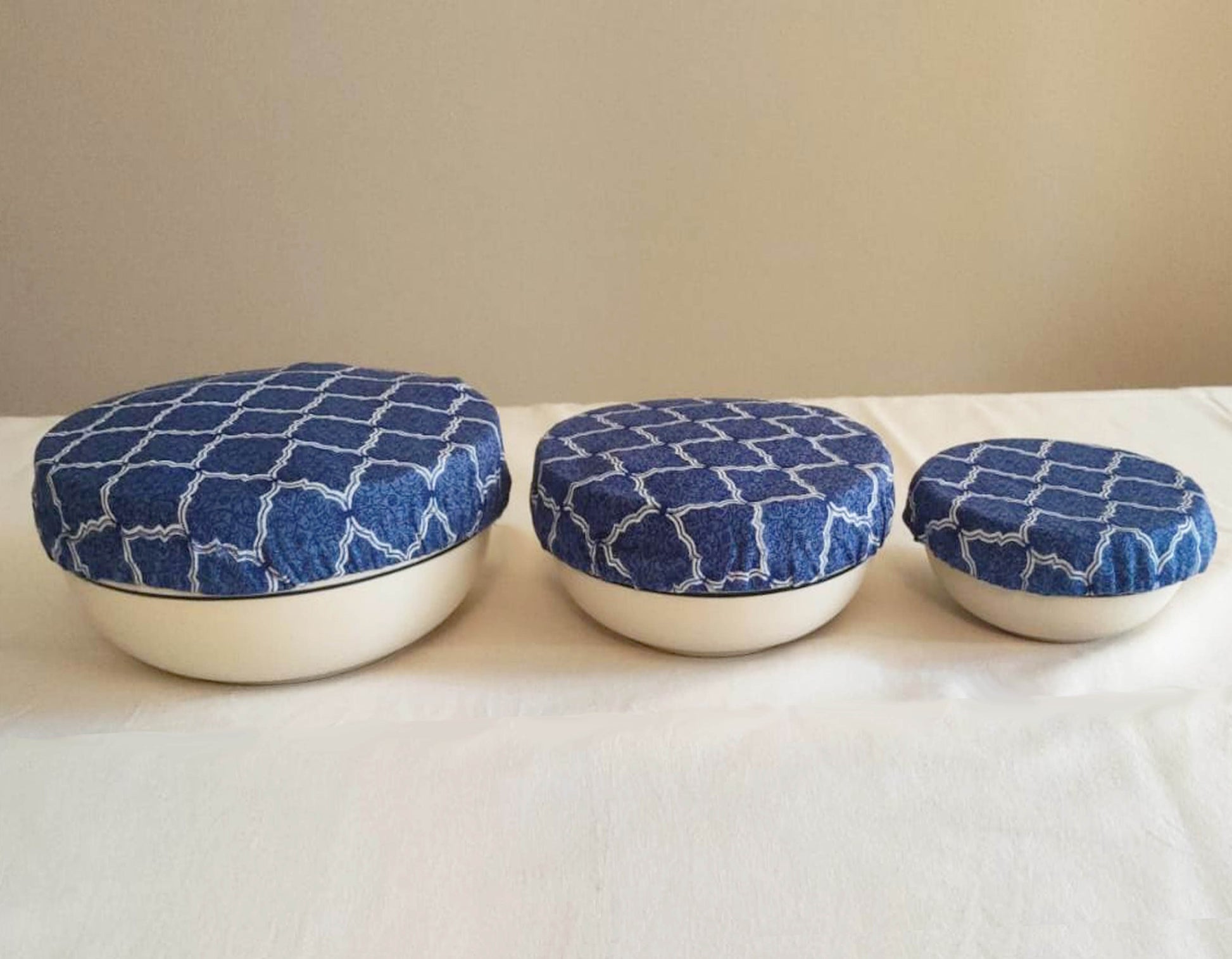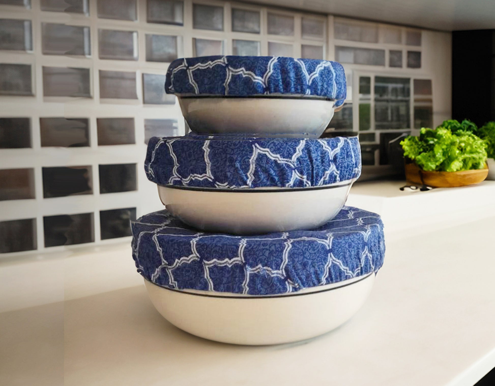 PRODUCT DESCRIPTION: This set of blue reusable cotton Mahua Bowl covers in varying sizes are sure to brighten up your kitchen schema. Protect your food from dust, flies or any other contamination with these washable covers.
