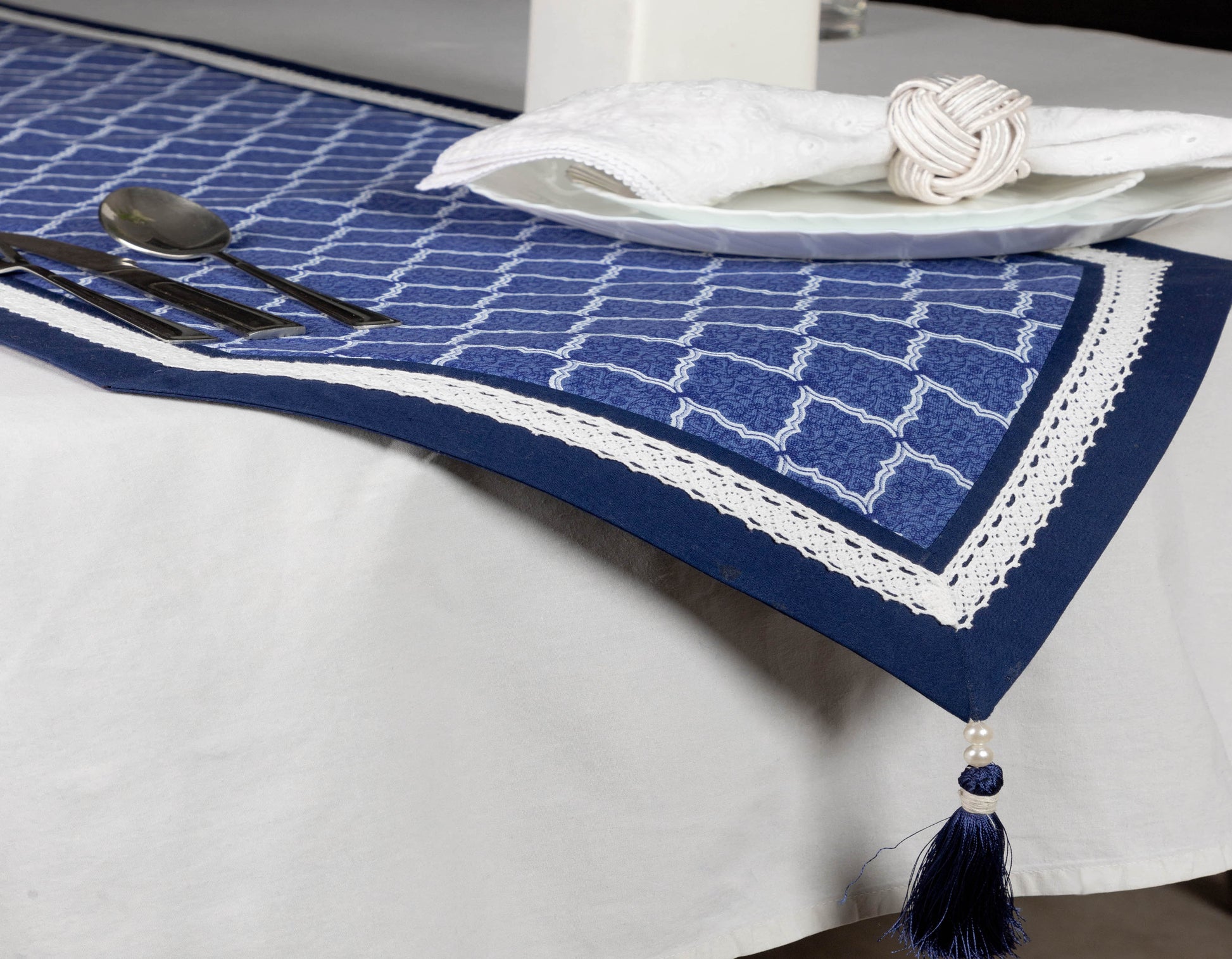 PRODUCT DESCRIPTION: Adorn your table with our beautifully designed Medora Table Runner with lacey edgings, a contrast border and tassel ends.