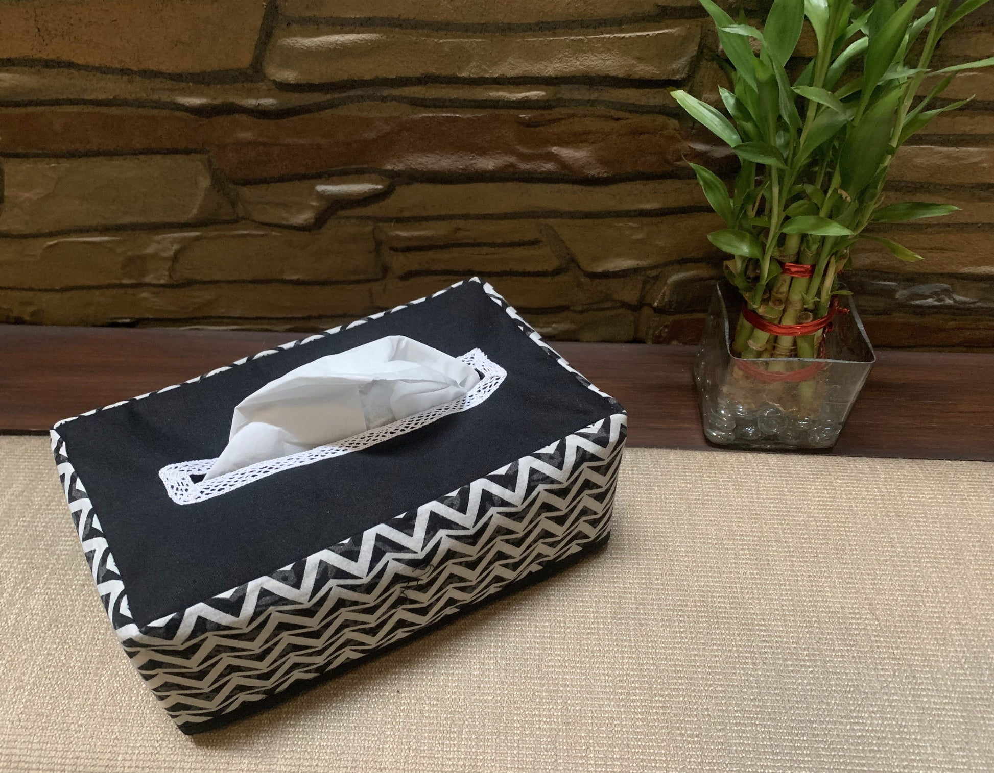 PRODUCT DESCRIPTION: This monochromatic upcycled Tissue Box Cover can be a stylish accessory for any setting.