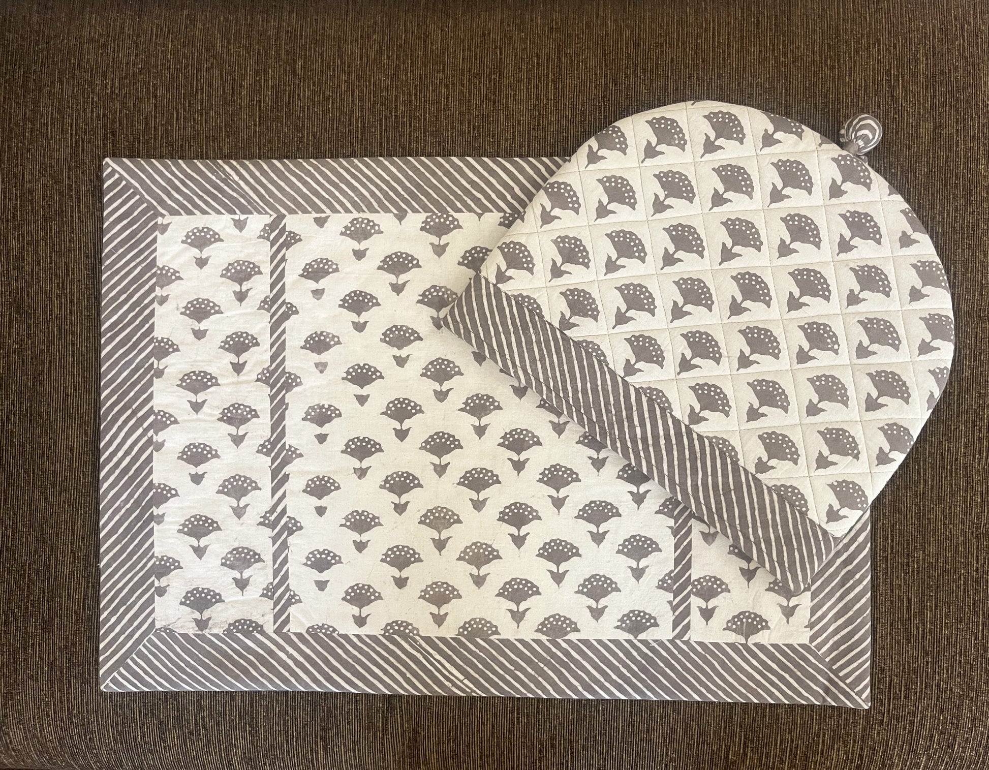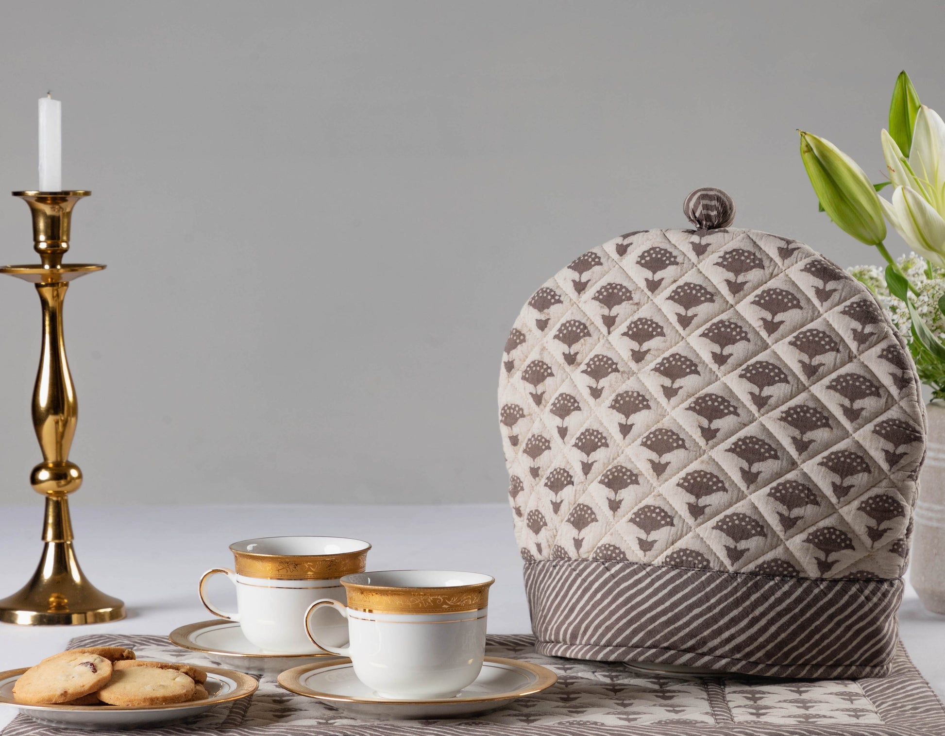 PRODUCT DESCRIPTION: This cotton handblock printed floral Tea Cozy & Tray cloth set will just add a touch of warmth to your cosy winter evenings.