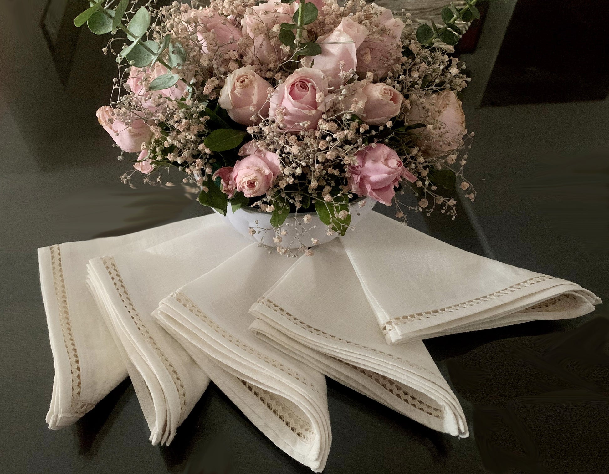 PRODUCT DESCRIPTION: Off-white dainty napkins with inlaid lace edgings