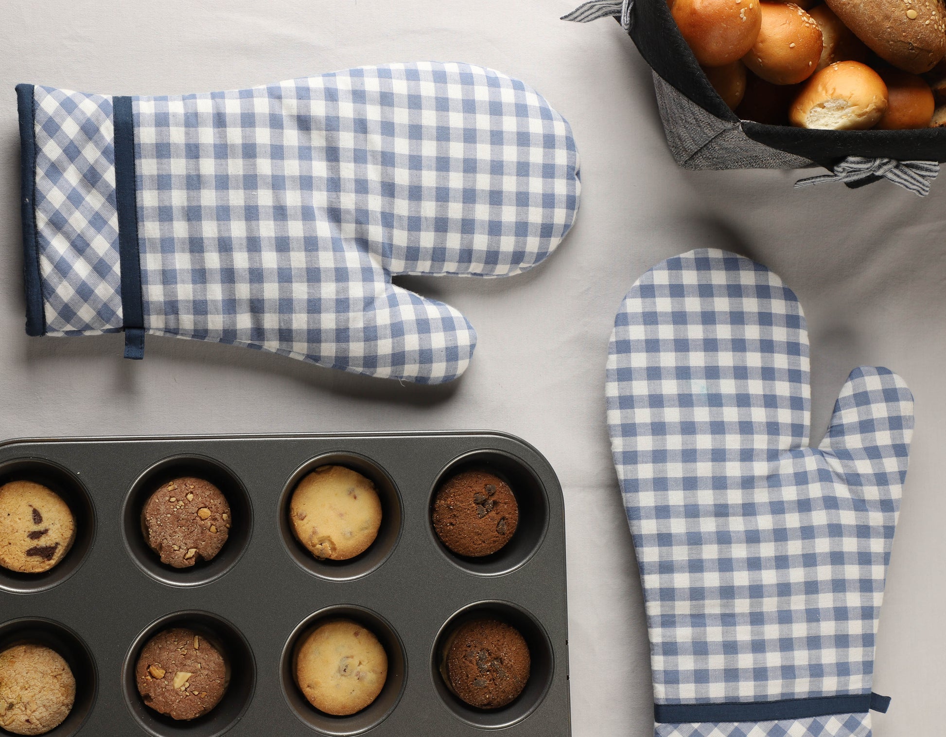 PRODUCT DESCRIPTION: Rupina Oven Mitts in light blue plaid fabric are the apt accessory for your baking needs in the kitchen. The heat resistant wadding can efficiently protect your hands.