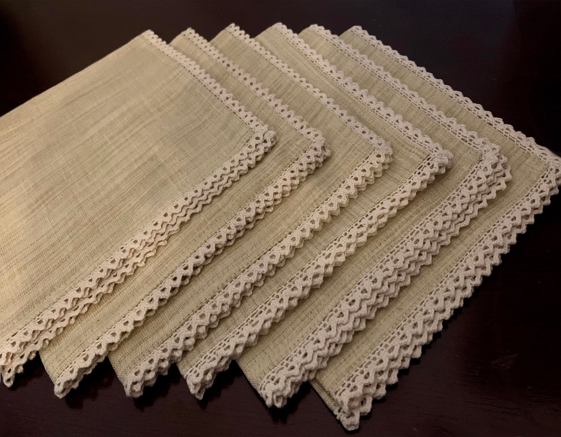 PRODUCT DESCRIPTION: Beige napkins with lace edgings for any table setup.