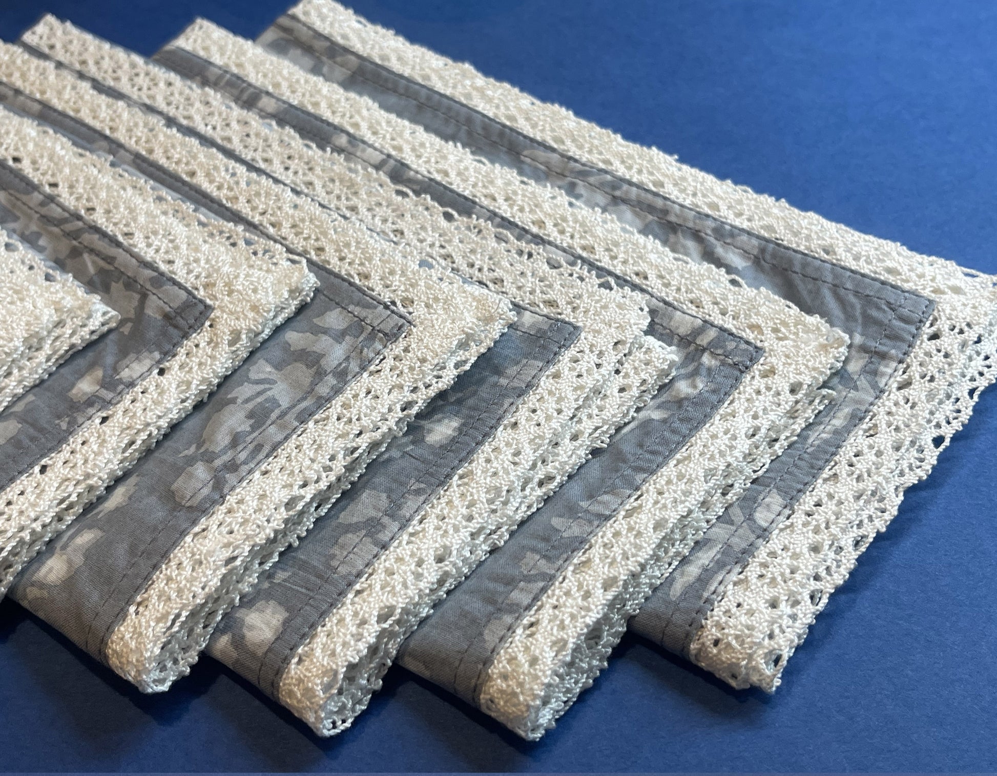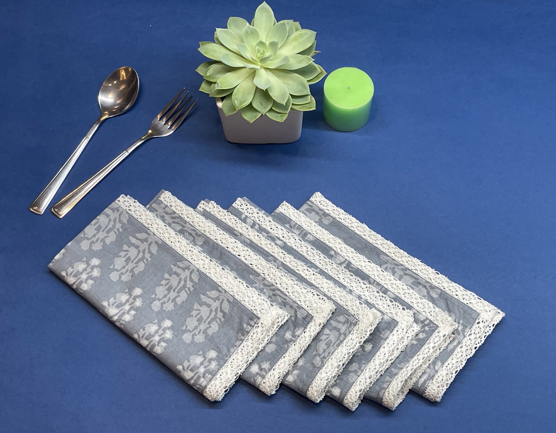 PRODUCT DESCRIPTION: Accentuate your table setting with our subtle coloured cotton printed Shawny Table Napkins with lace edgings. These come with matching napkin ties to add to the elegance.
