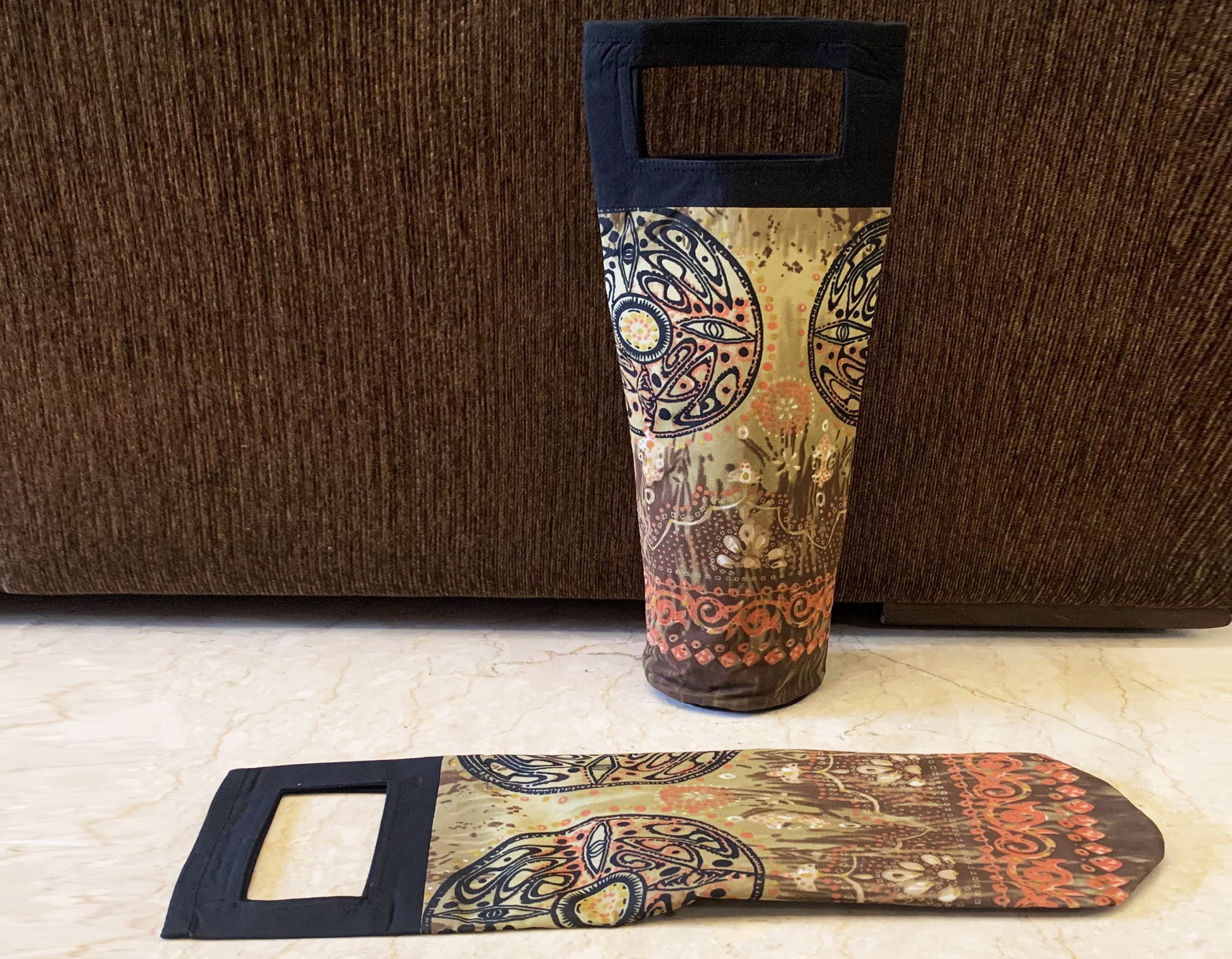 PRODUCT DESCRIPTION: These digital print Bottle bags with contrast black handles are made of surplus up-cycled blended fabric. These are washable and re-usable carry bags for any kind of bottles.