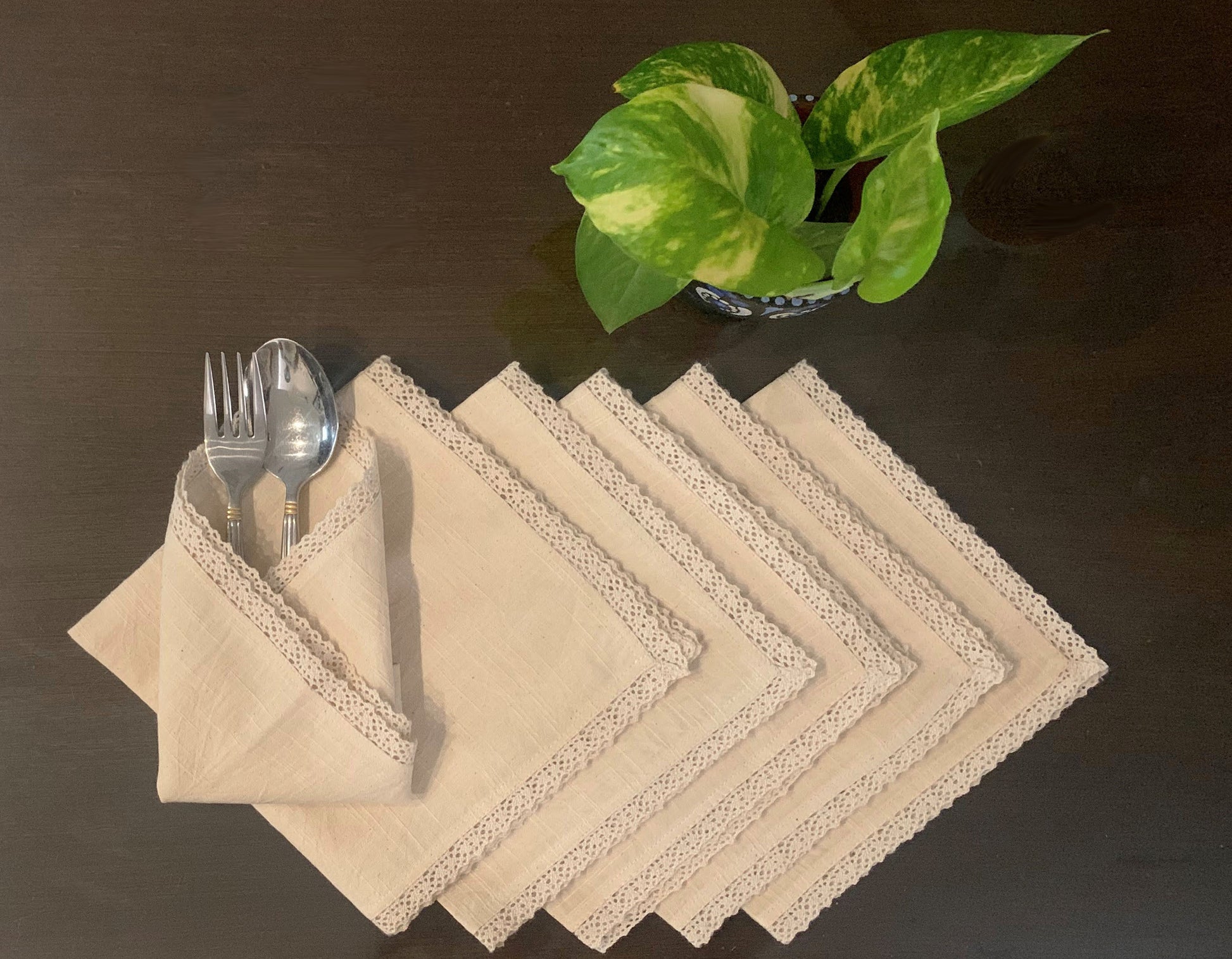 PRODUCT DESCRIPTION: These beautiful minimal napkins embellished with lace edgings blend effortlessly with any tablescape. Set of 4 napkins.